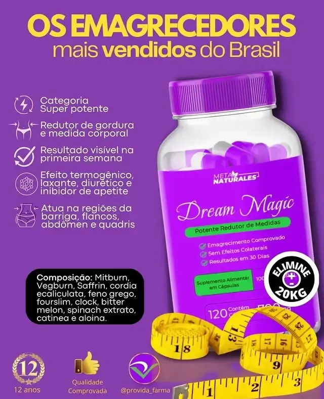 Dream Magic é um potente e revolucionário emagrecedor natural, desenvolvido com ativos de última geração que atuam em várias frentes do emagrecimento: queima de gordura localizada, controle da ansiedade, melhora da saciedade, aceleração do metabolismo e ação termogênica.